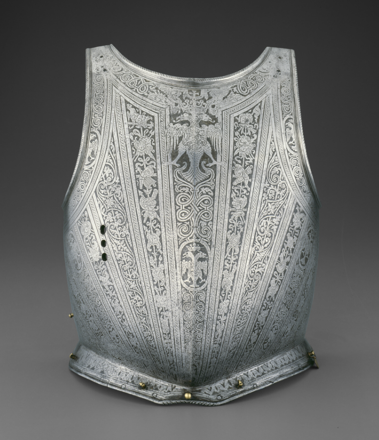 This piece is entitled Cuirass from an Armor of Tsar Dmitry I. It is from 1605 Milan, Italy, and is made of pure steel. The double headed eagle identifies the owner as Dmitry I, the Tsar of Russia who made false claims as to who is father was. After a little under a year of rule, he was shot and killed for his lie. The origins of the armor being in Italy may suggest that this piece was a diplomatic gift.