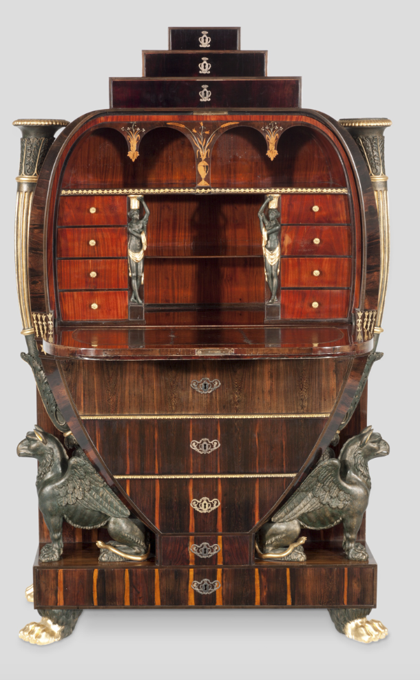 The piece to the left is entitled Fall-Front Desk. It's origins lie in Vienna, Austria, and it was crafted in 1810. This piece has the essence of the time it was made- the Napoleonic era. There are certain characteristic's that are telling of the piece's provenance- griffins, cornucopias, paw feet, and interior figures are classic to the Empire and Neoclassical techniques of the time.