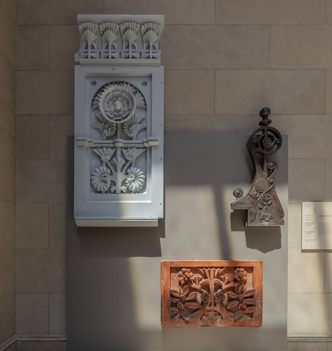 The piece on the top left is from the Frieze Section of the Rothschild Store. The top right shows a Newel Post from the Morris Selz House, and. the bottom piece is. a Spandrel Panel from the Rosenfield Building.